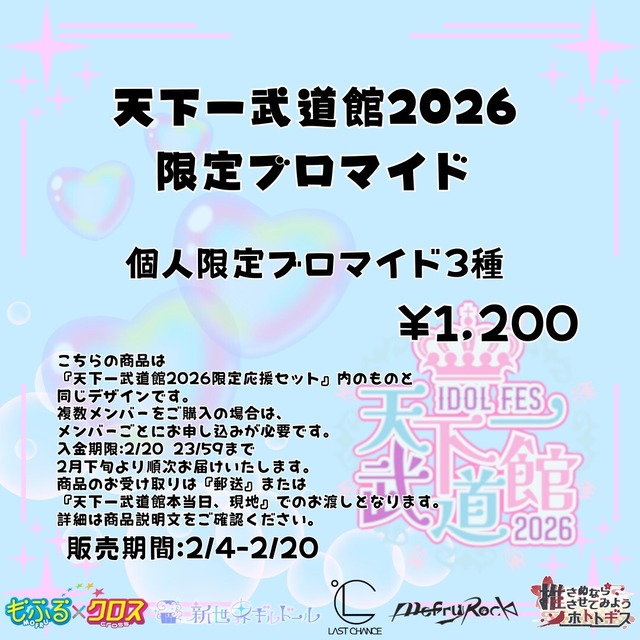 複数メンバーをご購入の場合はメンバーごとにお申し込みが必要となります。ご注意くださいませ。 ■配送・商品受取に関して 商品のお受け取りは、郵送または天下一武道館本当日、現地でのお渡しとなります。 ◦郵送の場合: 2月下旬より順次レターパックライトにて配送予定です。(送料別途¥430) ※天下一武道館当日までにお手元に届かない可能性がございます。あらかじめご了承ください。 ◦現地受取の場合: 天下一武道館当日に商品をお受け取り希望の方は、 物販テントにある「商品受付カウンター」にて【注文完了メール】をご提示ください (当日商品をお受け取りされた方は送料¥430分の割引券をお渡し致します) ️⭕️2/20 23:59までの販売となります❗ ■内容 ・限定ブロマイド3種セット