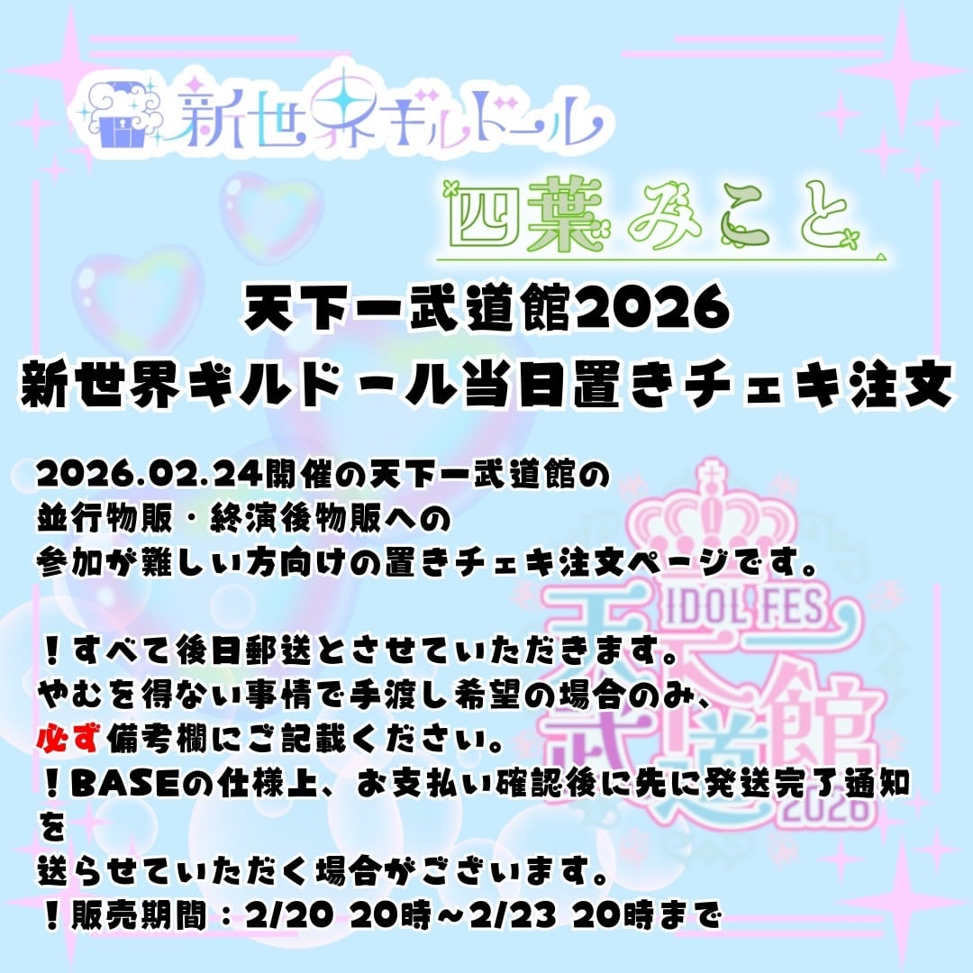2026.02.24開催の天下一武道館の並行物販・終演後物販に参加が難しい方向けの置きチェキ注文ページです。