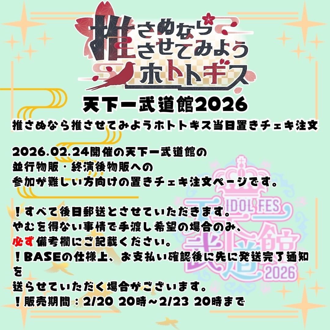 2026.02.24開催の天下一武道館の並行物販・終演後物販に参加が難しい方向けの置きチェキ注文ページです。