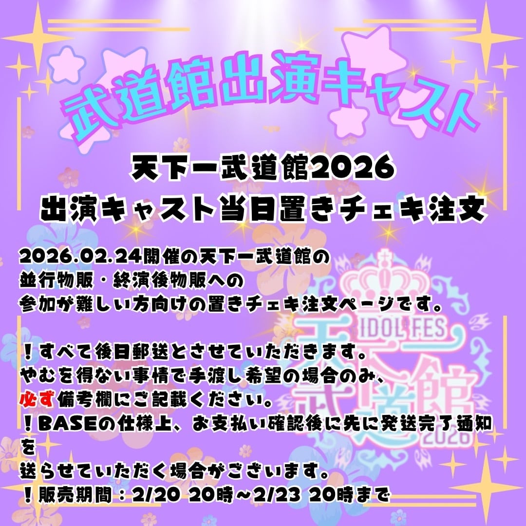 2026.02.24開催の天下一武道館の並行物販・終演後物販に参加が難しい方向けの置きチェキ注文ページです。
